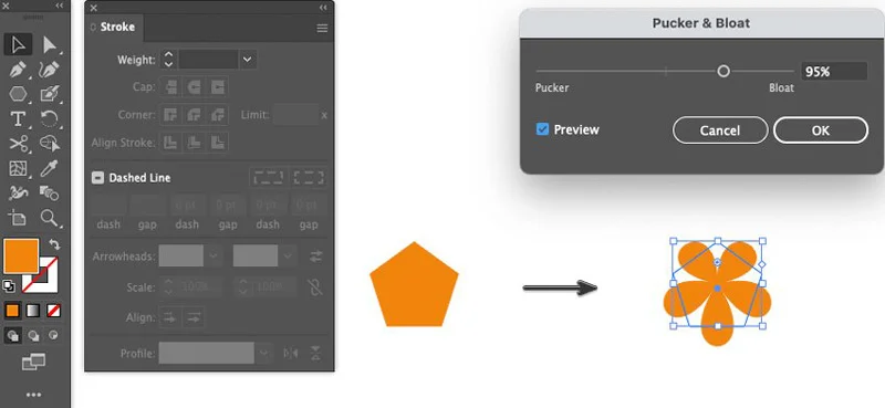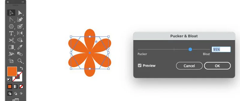 Stroke to be null and Fill color should be #D88425. Then apply a Pucker & Bloat effect. Effect > Distort & Transform > Pucker & Bloat which should be set around 95%.