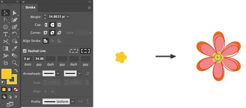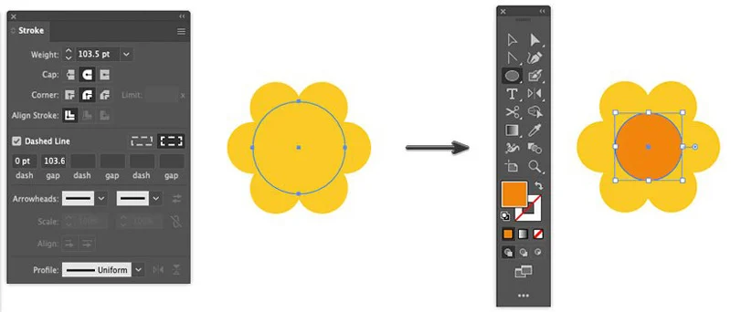Again, creating petals for another flower. Take the Ellipse Tool. In the Stroke panel, set the Stroke weight to 103.5 pt, Cap: Round Cap and Corner: Round Join and set Stroke and Fill color to #F0C93C. Check the Dashed Line box and set the dash to 0 pt and gap to 103.6 pt.