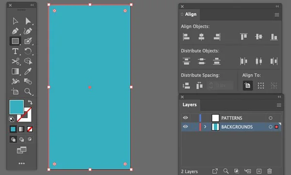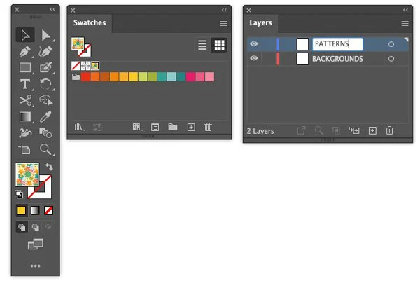 Open the Layers panel. Rename ‘Layer 1’ to ‘BACKGROUNDS’. Then click the Create New Layer icon and name the new layer ‘PATTERNS’.