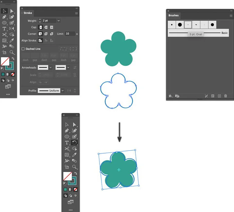 Open the Brushes panel (Window > Brushes) and apply #157F7F color and 3 pt Oval brush at 2 pt Stroke Weight to the duplicated shape.