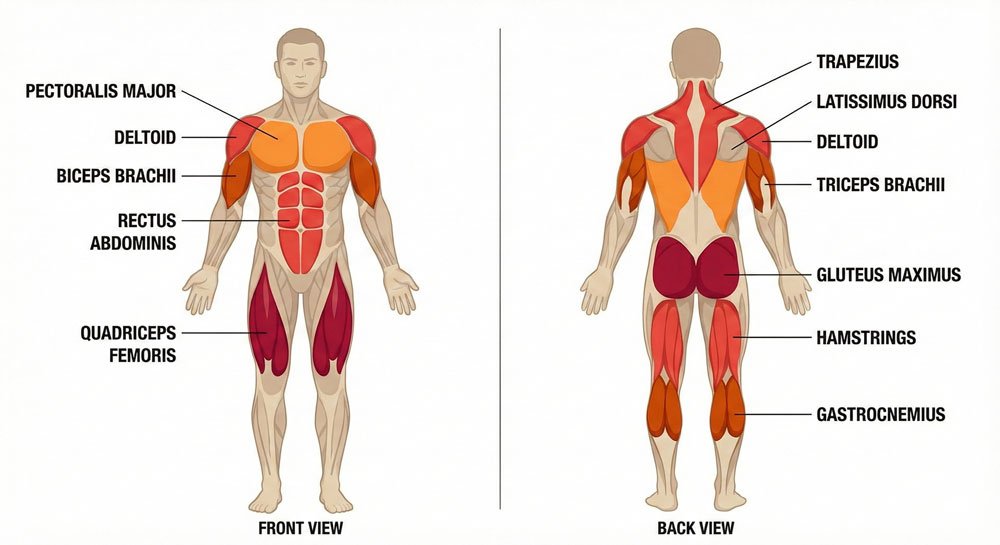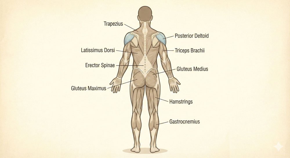 • Back muscles (latissimus dorsi) – Create the V-shape of the back and determine arm position