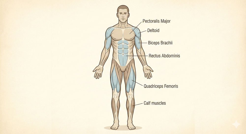 • Abdominal muscles (abs) – Create visible segments on the torso (when visible)