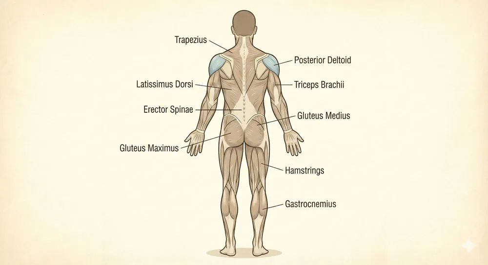 - Back muscles (latissimus dorsi) – Create the V-shape of the back and determine arm position