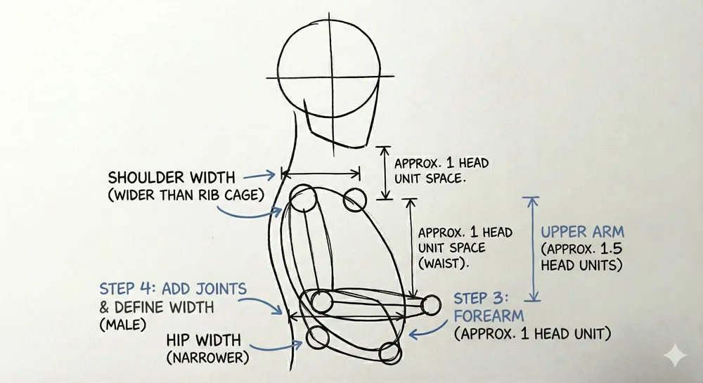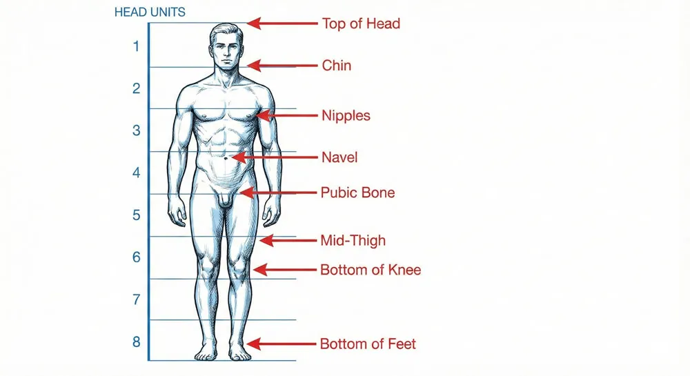 Why this system works: Your body isn’t randomly proportioned. There’s a mathematical harmony that makes figures look “right.” When you understand these landmarks, you can place everything correctly.