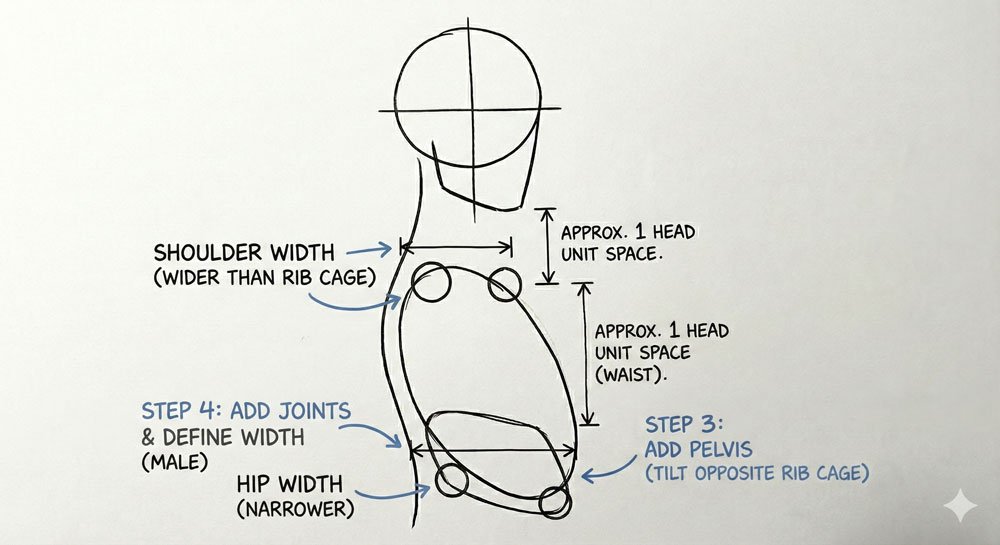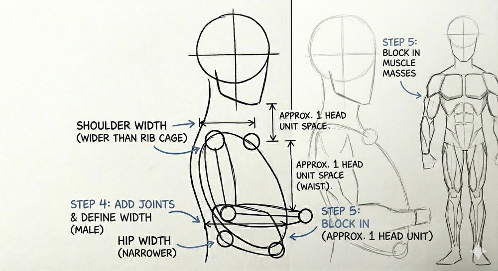 Why this system works: Your body isn’t randomly proportioned. There’s a mathematical harmony that makes figures look “right.” When you understand these landmarks, you can place everything correctly.