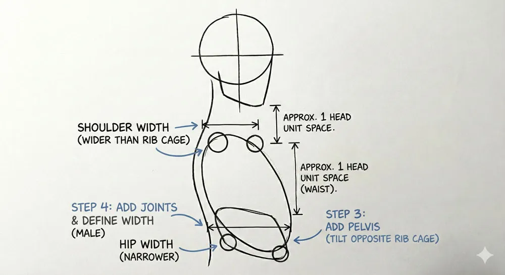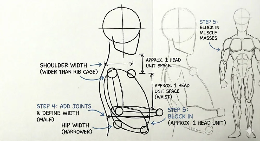 - Male figures: Wider shoulders, narrower pelvis, larger rib cage, more prominent muscle shapes (typically)