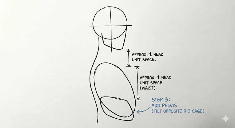 | Waist to pelvis | 3.5-4.5 heads | Determines lower torso |