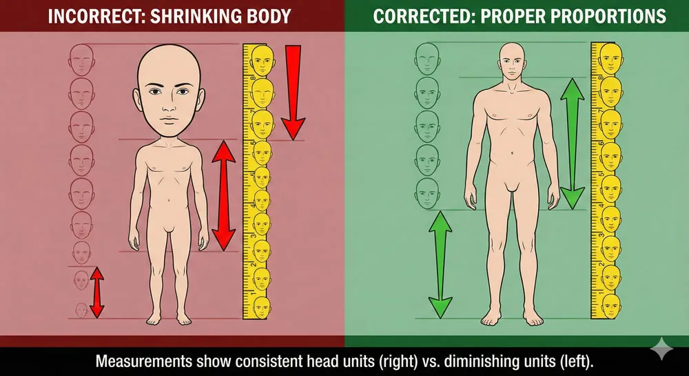 Every professional artist uses the same system: the head as a measuring unit. This is called “head units” or “heads tall.”