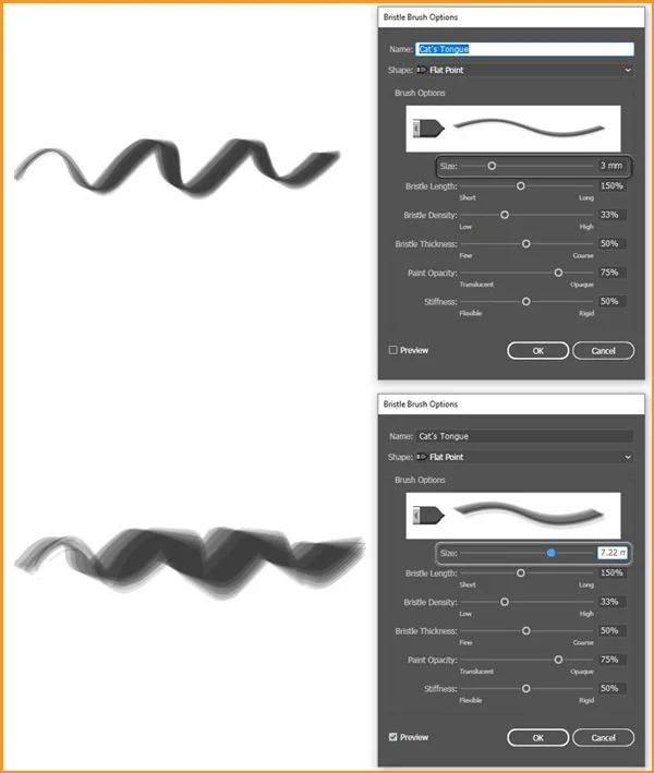 Open its drop-down menu and set it to Pressure. Just like in the Art Brushes, define the Minimum and Maximum size.