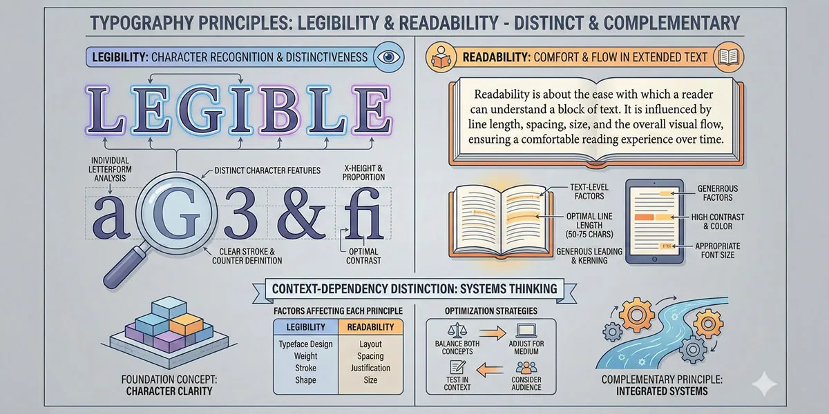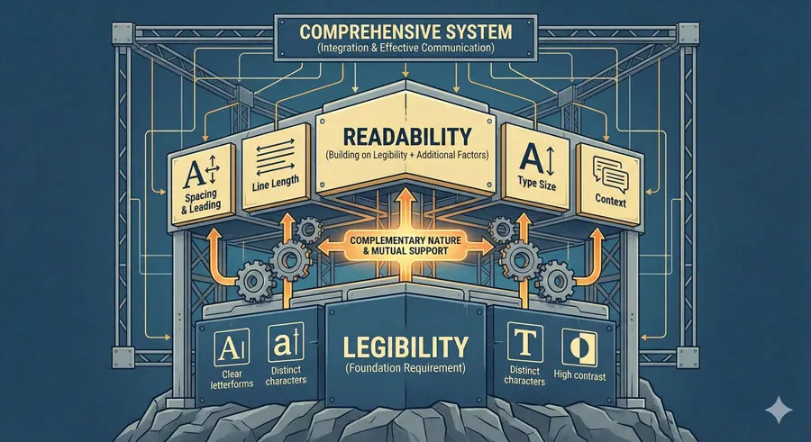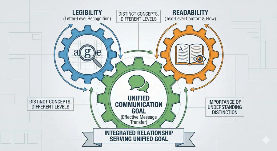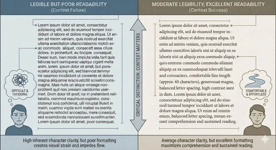 The critical distinction is that readability depends on context and deployment while legibility depends primarily on typeface structure.