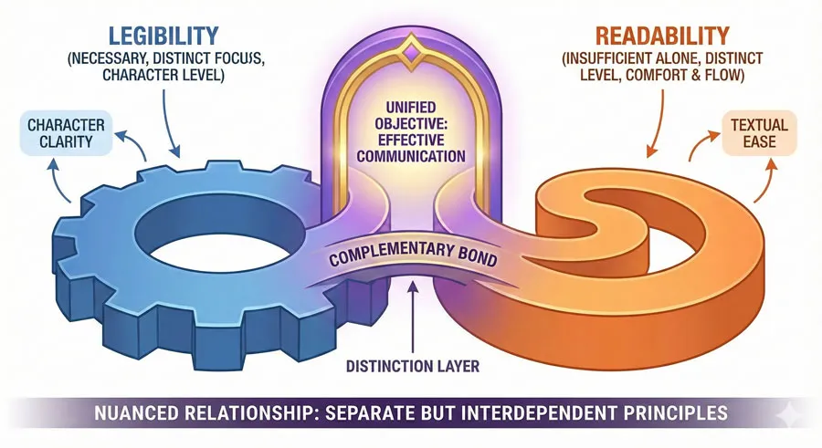 The relationship between legibility and readability is complementary but distinct. Legibility is the foundationโ€”if individual letterforms cannot be distinguished, readability will suffer. However, high legibility alone does not guarantee readability.