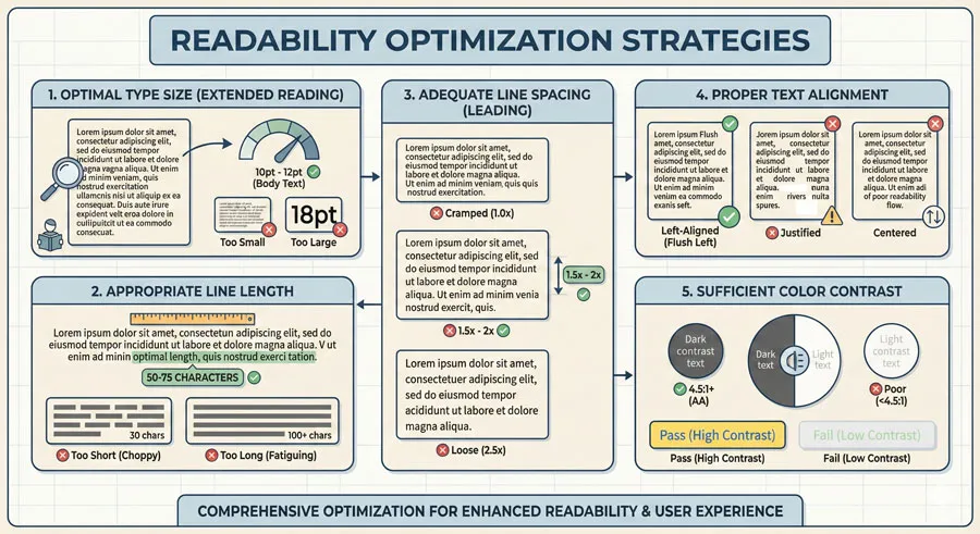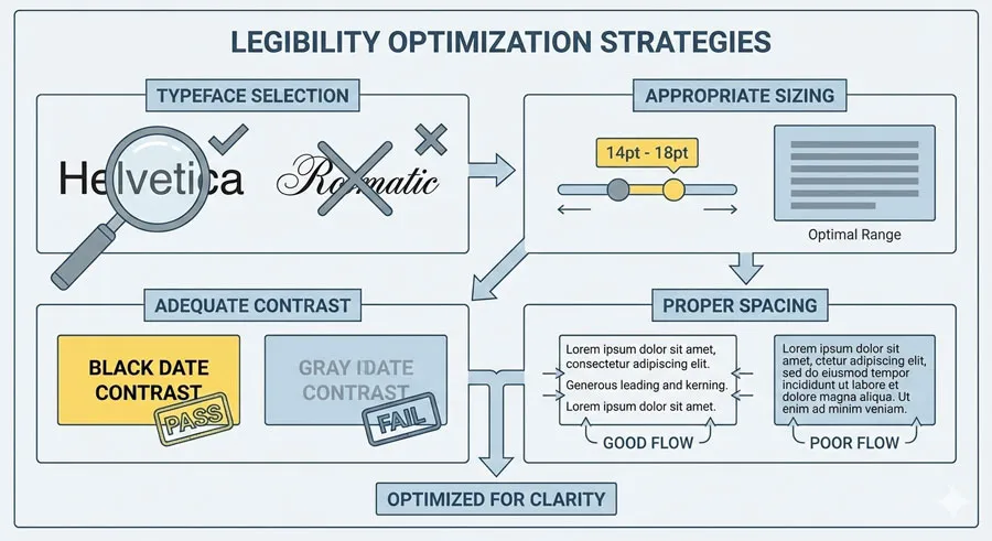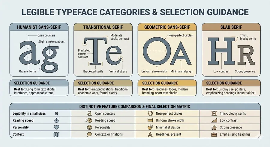 Understanding the distinction between legibility and readability is essential for designers. Legibility is the foundationโ€”selecting typefaces with clear, distinctive letterforms that can be easily recognized.