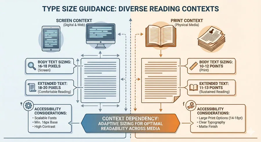 A: 16-18 pixels is often considered optimal for screen reading. Print reading typically uses smaller sizes (10-12 points) due to different reading distances.