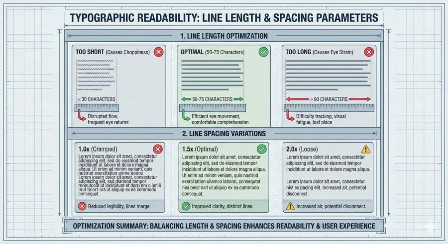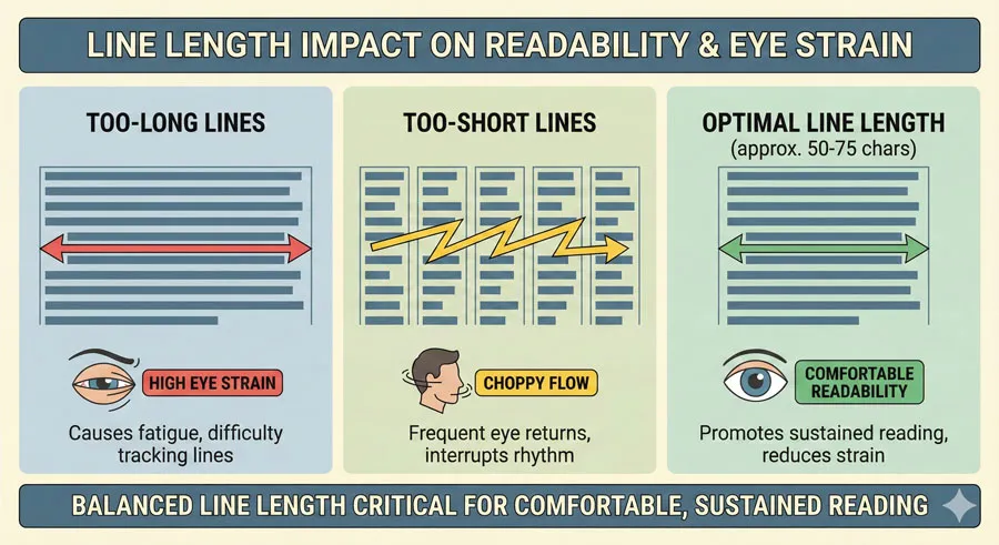 Line length is one of the most impactful readability factors, yet designers often neglect it. Lines that are too long or too short reduce readability.