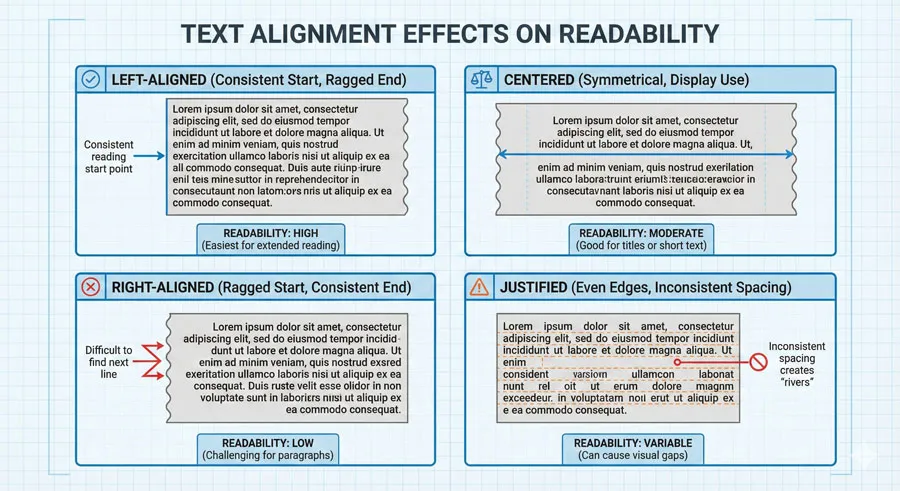 A: Justified text can reduce readability because it requires uneven word spacing to maintain right margin alignment. Left-aligned text typically provides better readability.