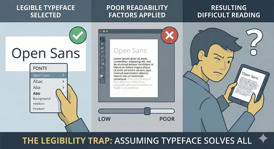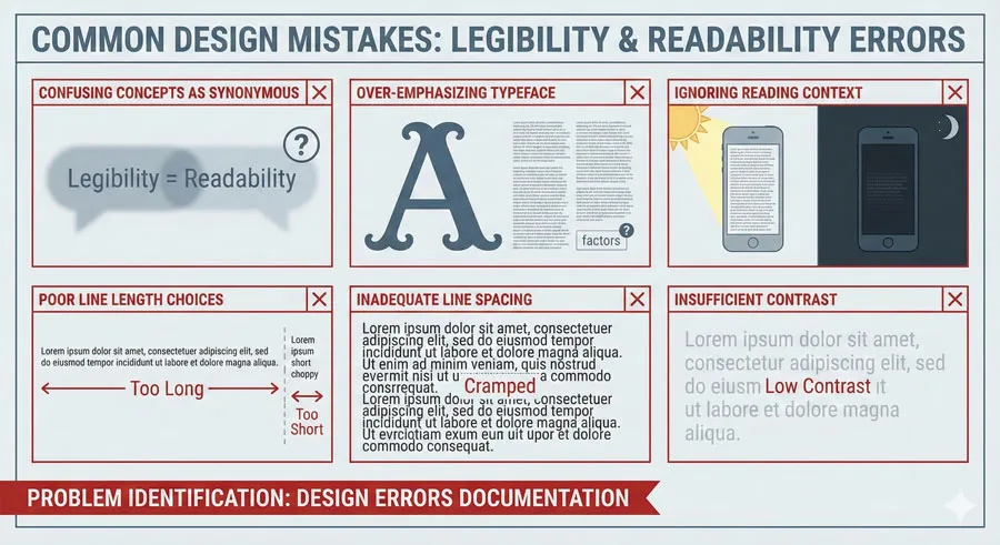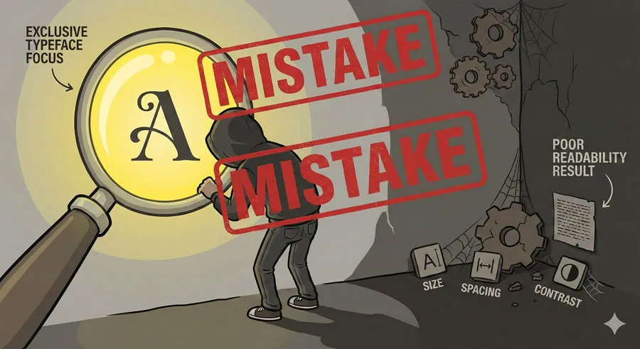 The most common mistake is assuming that selecting a “legible” typeface solves typography problems. Designers often focus exclusively on typeface selection while neglecting other readability factors.