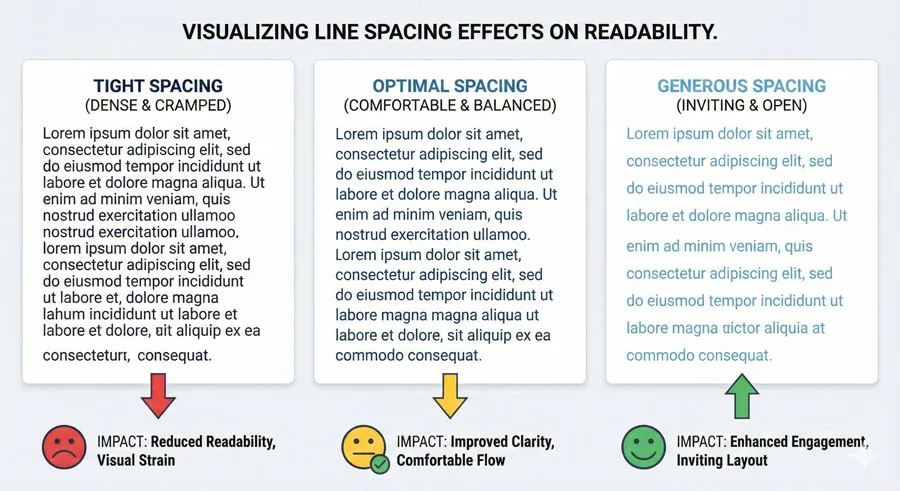A: Line spacing significantly affects readability. Adequate line spacing (typically 1.5 to 2 times the line height) improves readability, while cramped line spacing reduces readability and increases visual fatigue.