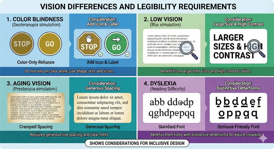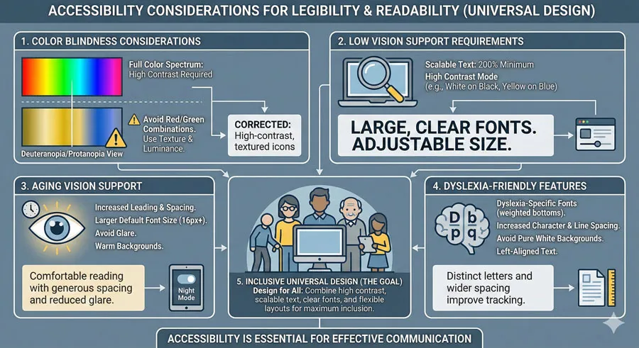Different readers have different vision capabilities. Legibility considerations must account for: