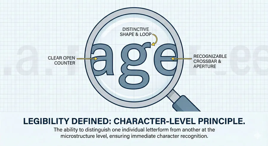 Legibility is the degree to which individual letterforms can be distinguished from one another and recognized quickly. A highly legible typeface features letterforms that are distinctive and unmistakable. The letterforms are structured so that similar letters are clearly differentiated.