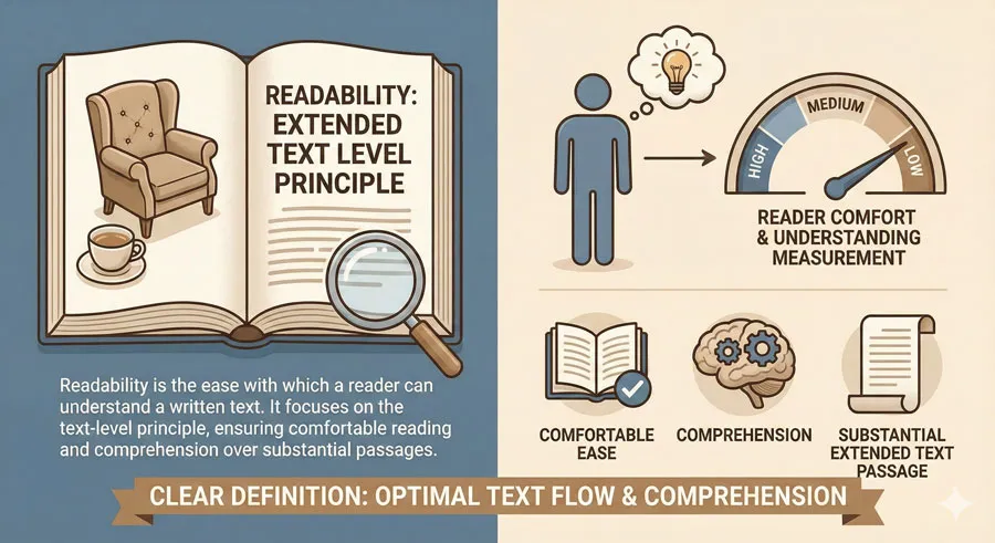 Readability is the ease with which extended text can be read and understood. A readable design is one where a reader can comfortably read substantial amounts of text without fatigue or confusion.