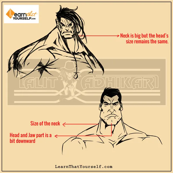 In the second priority, Iโve told that neck is usually bigger in these powerful masculine characters and not just bigger, the head and jaw part is also a bit downward.