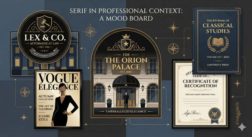 Serif typefaces are strongly associated with formal communication. Law firms, government institutions, and financial services companies frequently use serif typefaces in their branding and communications. When you need to communicate that something is official, legal, or binding, a serif typeface is the default choice.