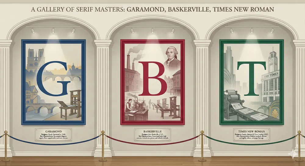 Serif typefaces are characterized by small decorative lines, called serifs, that extend from the ends of letterforms. These decorative terminals can be subtle (as in Garamond or Times New Roman) or prominent and bracketed (as in Baskerville or Palatino).