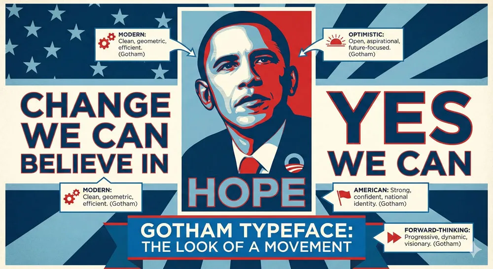 When Barack Obama’s 2008 presidential campaign selected the typeface Gotham, they were making a deliberate psychological choice. Gotham, a geometric sans-serif with American roots and contemporary appeal, communicates modernity, strength, and forward-thinking optimism. It is no accident that this typeface has become synonymous with political hope and change.