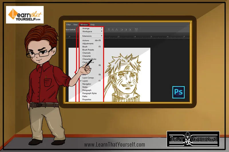 Layers option opens up the Layer Panel. Usually, it is ‘checked’ by default but if it is unchecked you can go to the Window menu and click on the ‘Layer’ to make it visible. The shortcut key for this option is F7