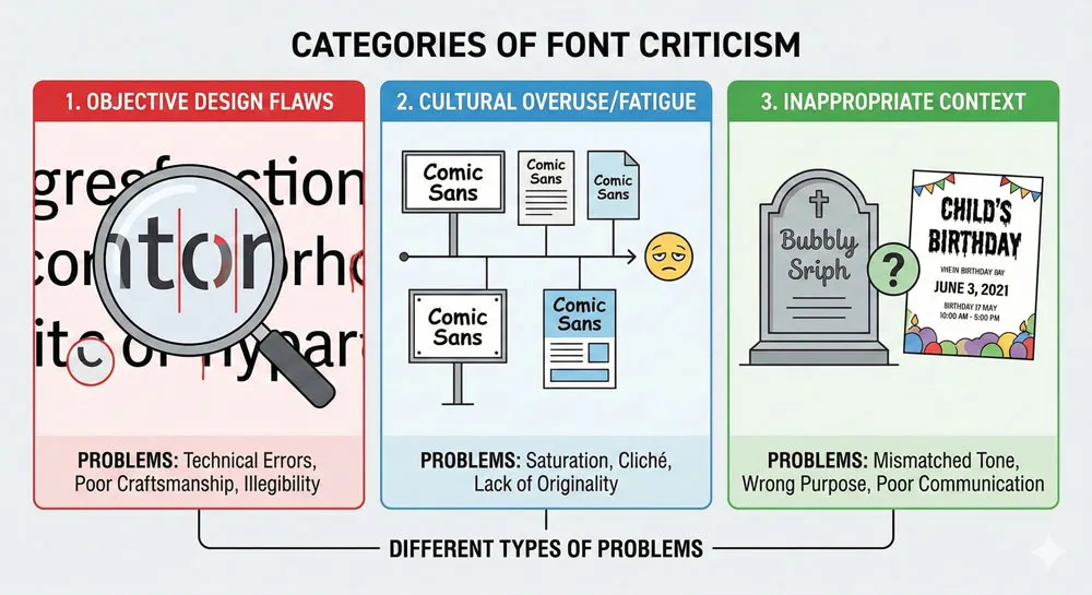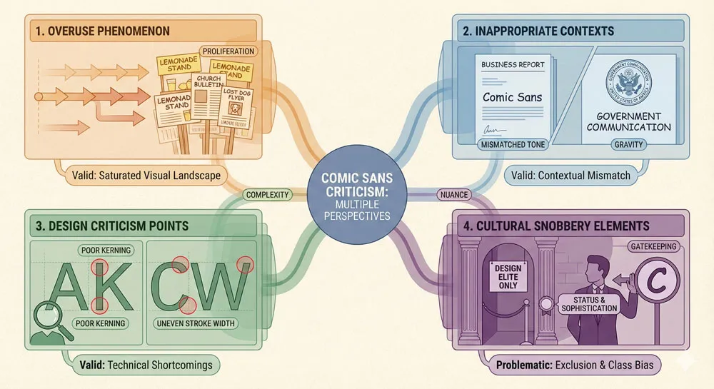 A: Designers criticize Comic Sans for overuse, inappropriate deployment, and association with poor design decisions. However, some of this criticism reflects gatekeeping rather than legitimate design principles.