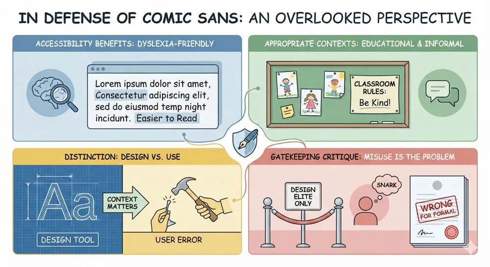 Dismissing fonts can exclude people with accessibility needs. Comic Sans criticism, for example, creates tension with the reality that Comic Sans serves important accessibility functions.