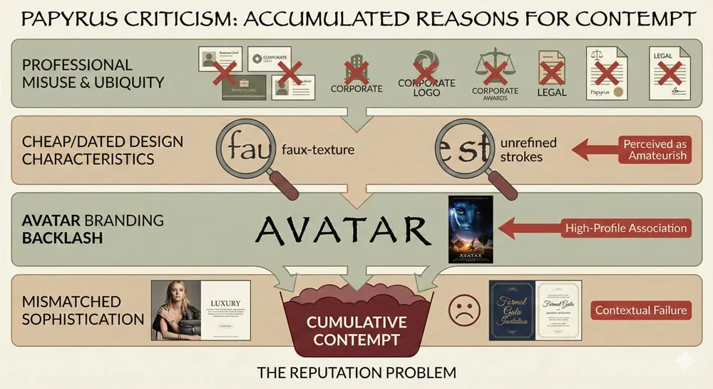 The Avatar effect: The 2009 film Avatar used Papyrus extensively for its marketing and branding. This high-profile use of Papyrus by a major film franchise seemed to validate Papyrus as an acceptable mainstream font, triggering intense backlash from design professionals.