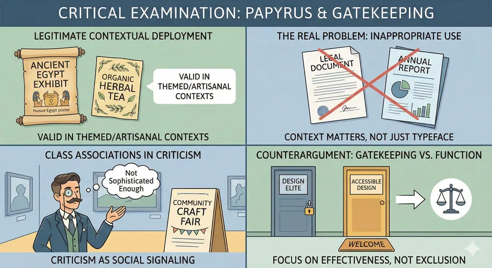 Papyrus, for example, has gained a reputation as a “bad” font partly because it has been extensively used in inappropriate contextsโ€”on professional business communications, government documents, formal brandingโ€”where its casual, decorative character is entirely inappropriate.