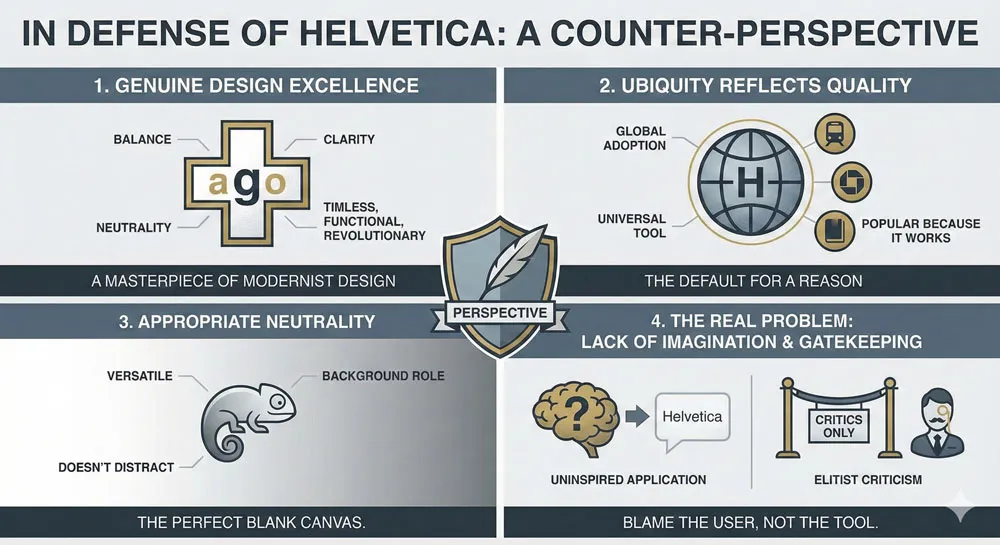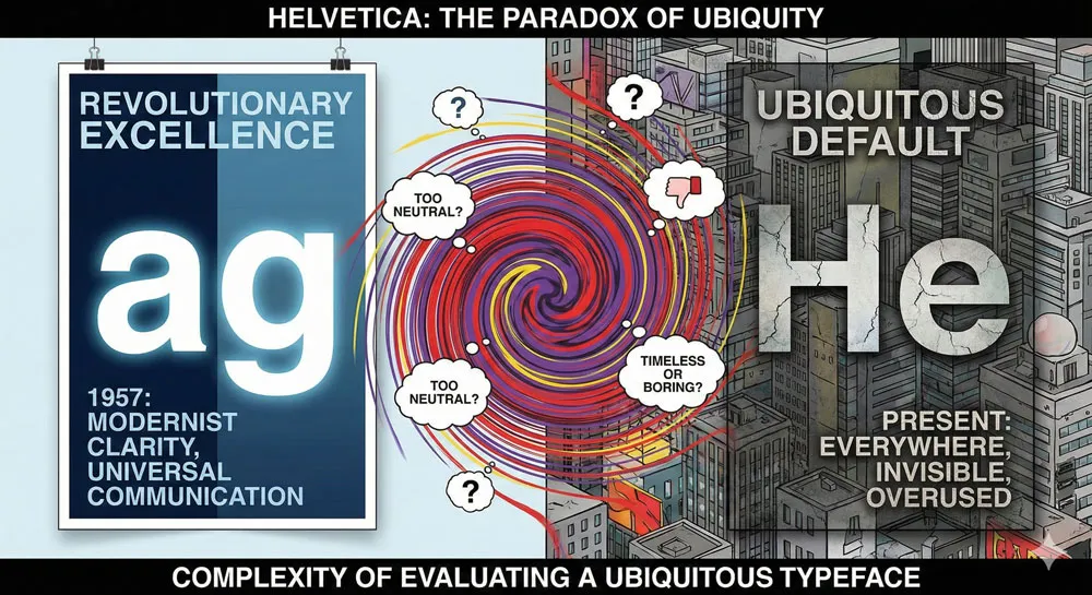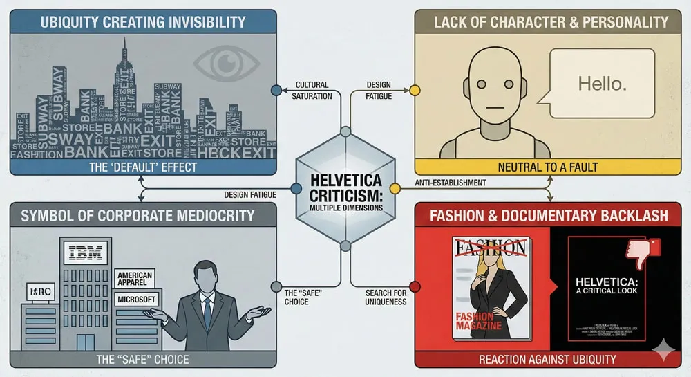A: Helvetica criticism reflects its ubiquity and the resulting design mediocrity from default Helvetica choices. The criticism is often directed at how Helvetica is deployed rather than the typeface itself.