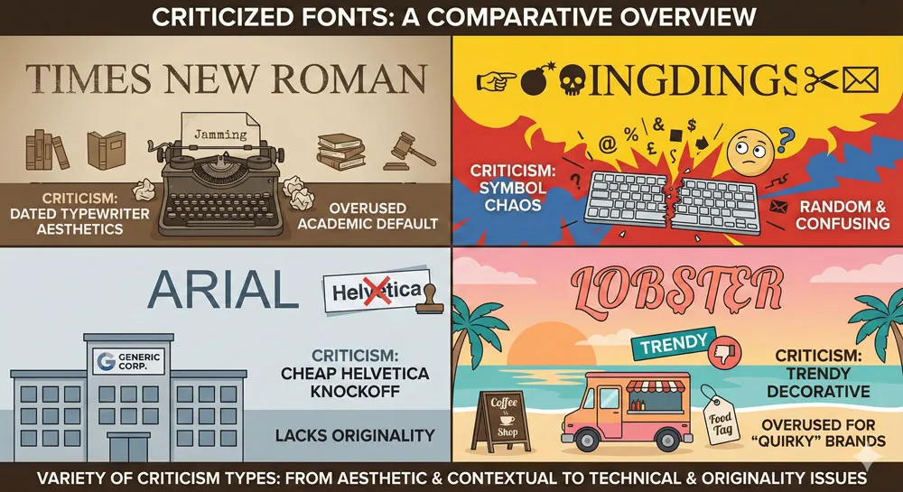 Contemporary criticism focuses on typefaces like Lobsterโ€”trendy decorative fonts that designers overuse until they become associated with poor design fashion.