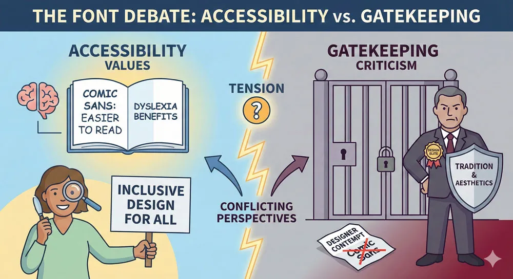 Comic Sans criticism particularly problematizes gatekeeping because Comic Sans is one of the most readable typefaces for people with dyslexia. The design community’s dismissal of Comic Sans creates tension with accessibility and inclusive design values.