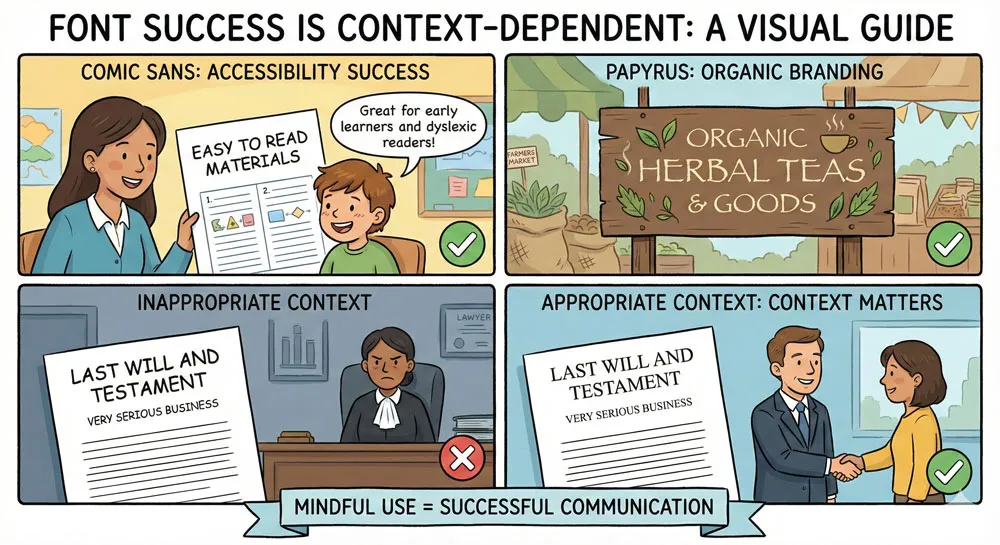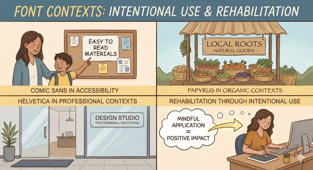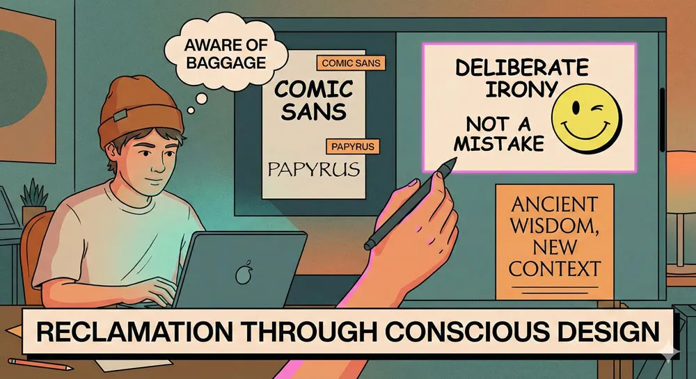 Some contemporary designers have begun reclaiming “bad” fonts through ironic or intentional use. Using Comic Sans or Papyrus intentionally, knowing the cultural baggage these fonts carry, can be a design choice rather than an error.
