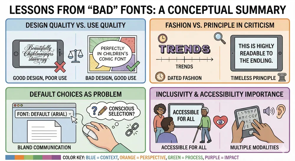 The ultimate lesson is that there are few truly “bad” fonts, but there is such a thing as bad design choicesโ€”the thoughtless deployment of typefaces without consideration of appropriateness, context, or communication goals.