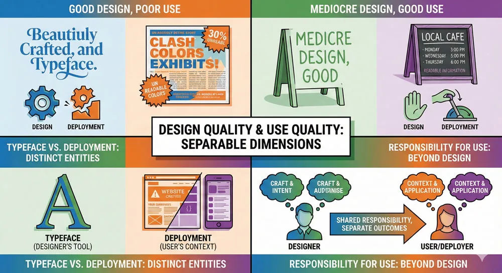 Yet legitimate criticism also exists. Some fonts have genuine design problems. Some uses of typefaces are genuinely inappropriate. Some deployment of fonts reflects thoughtlessness rather than intentional design choice.