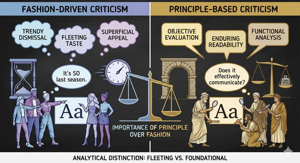 Much font criticism reflects fashion rather than design principle. Fonts become despised not because they are objectively poorly designed but because fashion has moved on, or because certain designers have established that the font is “bad.”